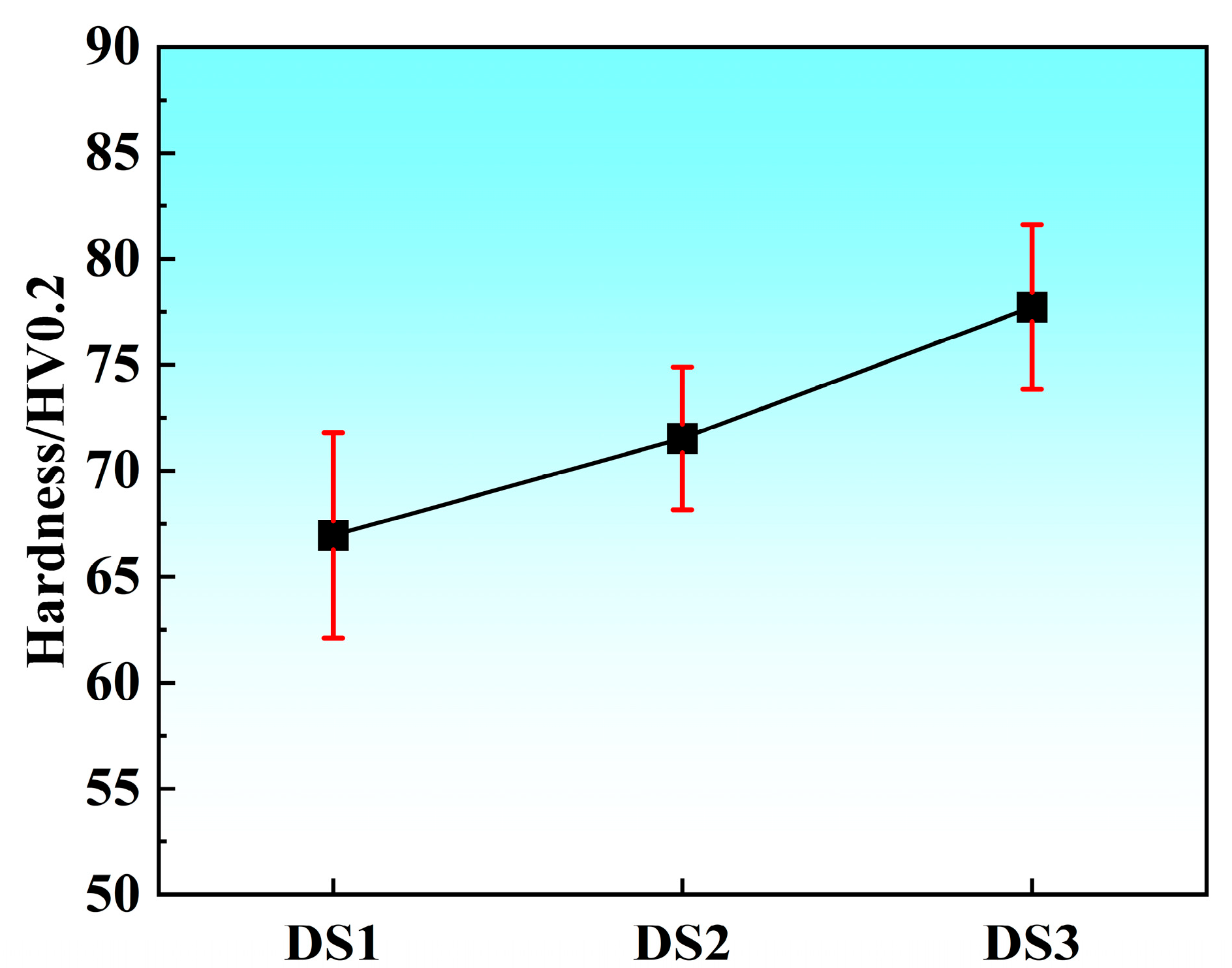 Figure 11 shows the micro-Vickers hardness test results of the alloy series. As the Sm content increases, the average hardness of the alloys continuously rises. This is mainly attributed to the combined effects of the following factors: increased solute atom content in the solid solution leading to enhanced lattice distortion and greater impediment to dislocation movement; grain refinement effects contributed by Zr and rare earth elements; and the obstruction of matrix deformation by secondary phases formed through rare earth additions. The synergy of these multiple strengthening mechanisms significantly improves the overall hardness of the alloys.