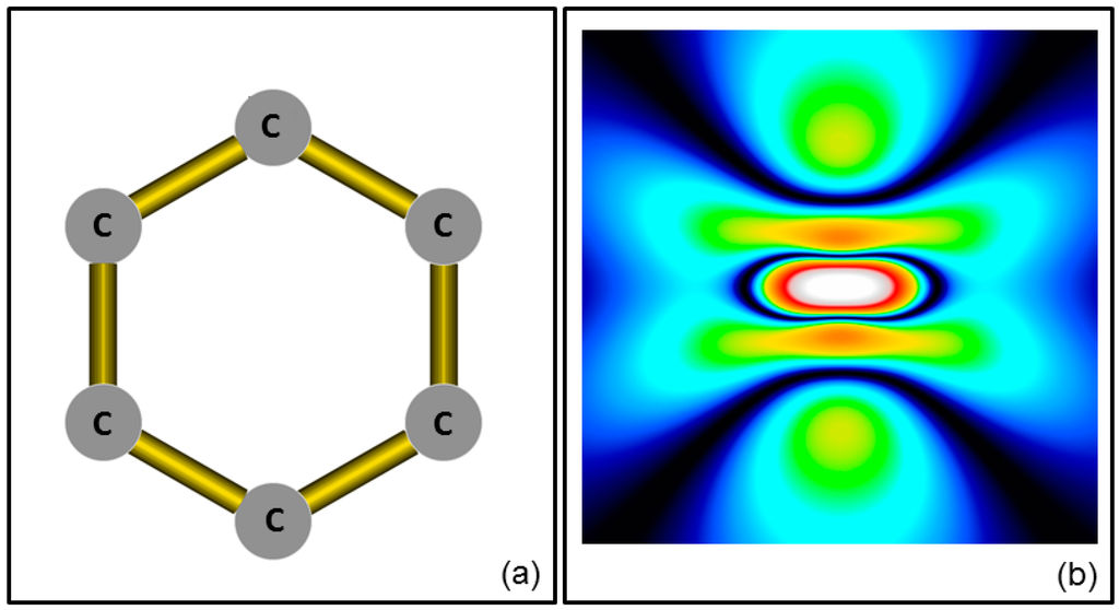 (a) Hexagonal ring of carbon atoms; and (b) its molecular form factor (λ = 1.540562 Å, detector pixel size = 100 µm, linear detector size = 20 cm; sample-to-detector distance = 5 cm).