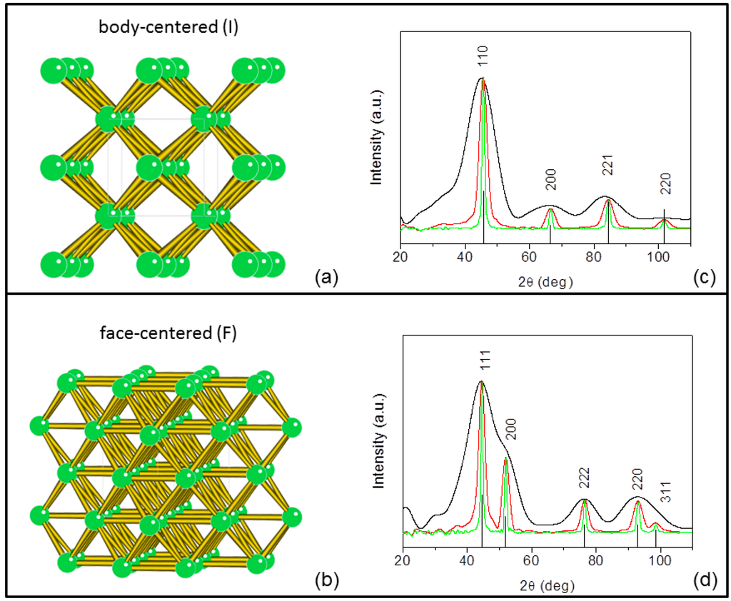 (a) Body centered cubic nickel lattice (ICSD database code 183264, i.e., a = b = c = 2.81 Å, α = β = γ = 90° and space group = I m − 3 m); (b) face centered cubic nickel lattice (ICSD database code 181716, i.e., a = b = c = 3.227 Å, α = β = γ = 90° and space group = F m − 3 m); (c) simulated diffraction patterns for the ICSD 183264 structure; (d) simulated diffraction patterns for the ICSD 181716 stucture. The simulated profiles are computed for a crystalline box containing 3 × 3 × 3 (black profile), 10 × 10 × 10 (red profile) and 30 × 30 × 30 (green profile) unit cells. Wavelength used for calculation: λ = 1.540562 Å.