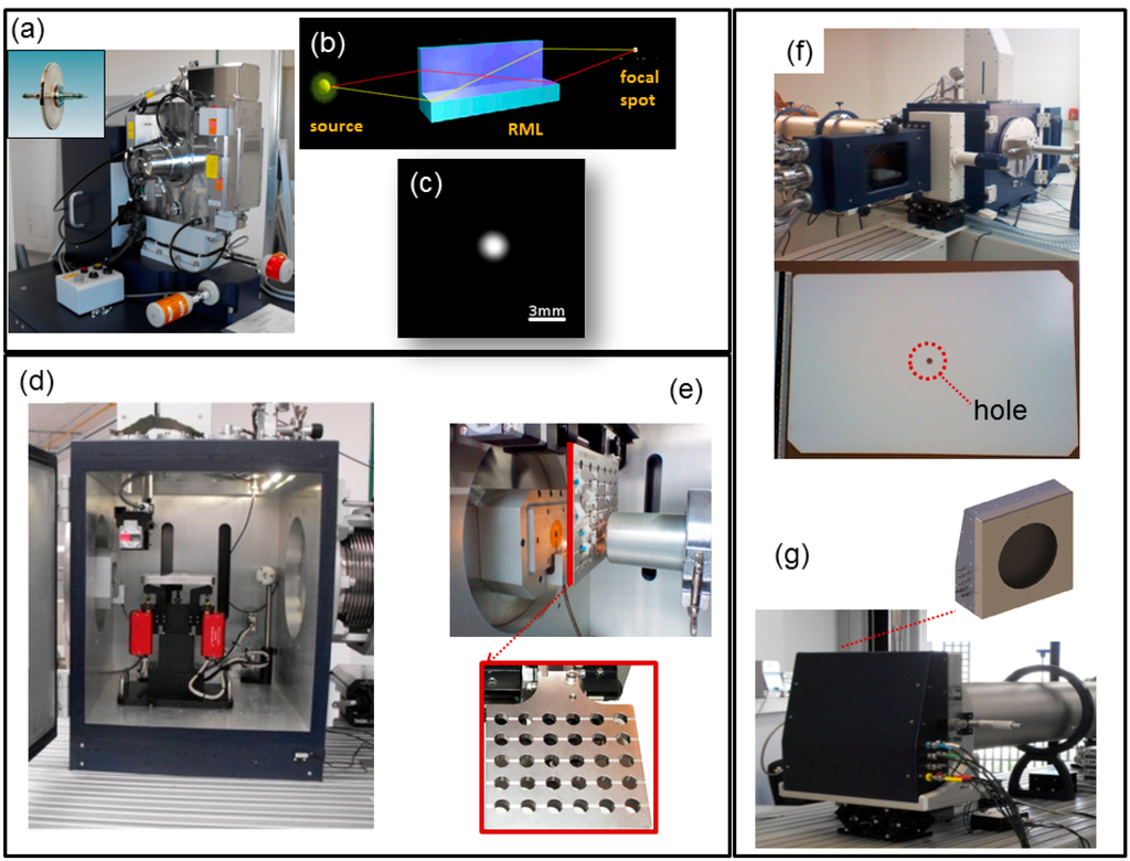 Figure 4a shows the rotating anode micro-source installed at the XMI-L@b [,,,]. The copper target is displayed in the inset of the figure. This laboratory consists of a three-pinhole SAXS/WAXS camera, working in vacuum, with the table-top rotating anode micro-source coupled to a RML confocal optics (Figure 4b) to realize a round shaped sub-millimetric focal spot (minimum size is 70 µm). The image of the focal spot, with specific pinholes, projected at about 2.2 m from the sample, is shown in Figure 4c. For reflection mode geometry, a goniometer is used (Figure 4d) to align the sample surface with respect to the X-ray beam and to tune the penetration depth of the X-ray beam below the surface. This is the typical set-up needed for GISAXS and GIWAXS measurements. The sample holder, for transmission geometry, is displayed in Figure 4e. Kapton or ultralene pockets are used for powders or jelly specimens, glass capillaries or cuvettes are used for liquids.