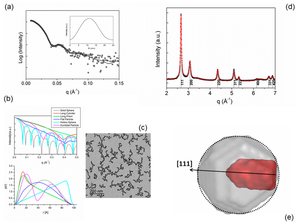 (a) SAXS data of silver nanoparticles dispersed in water, with pair distribution function (PDF) of scattering objects with spherical shape (inset); (b) SAXS (up) and PDF (down) simulated profiles for scattering objects of different shape (grey: full sphere, red: cylinder, green: prism, blue: disk; cyan: hollow sphere; magenta: dumbbell); (c) Transmission electron microscopy (TEM) image of the sample reported in (a); (d) WAXS data (dotted curve) collected on the sample in (a) and the corresponding fitted profile (red line) calculated for the silver crystal structure, ICSD code # 181730, face centered cubic lattice (space group F m−3 m) with a cubic cell of a = 4.086 Å; (e) crystalline domain (red colored volume) extracted from WAXS data analysis, reported in scale with respect to the whole nanoparticle spherical size (grey full sphere) extracted from SAXS data analysis. Partially reprinted with permission from reference [].