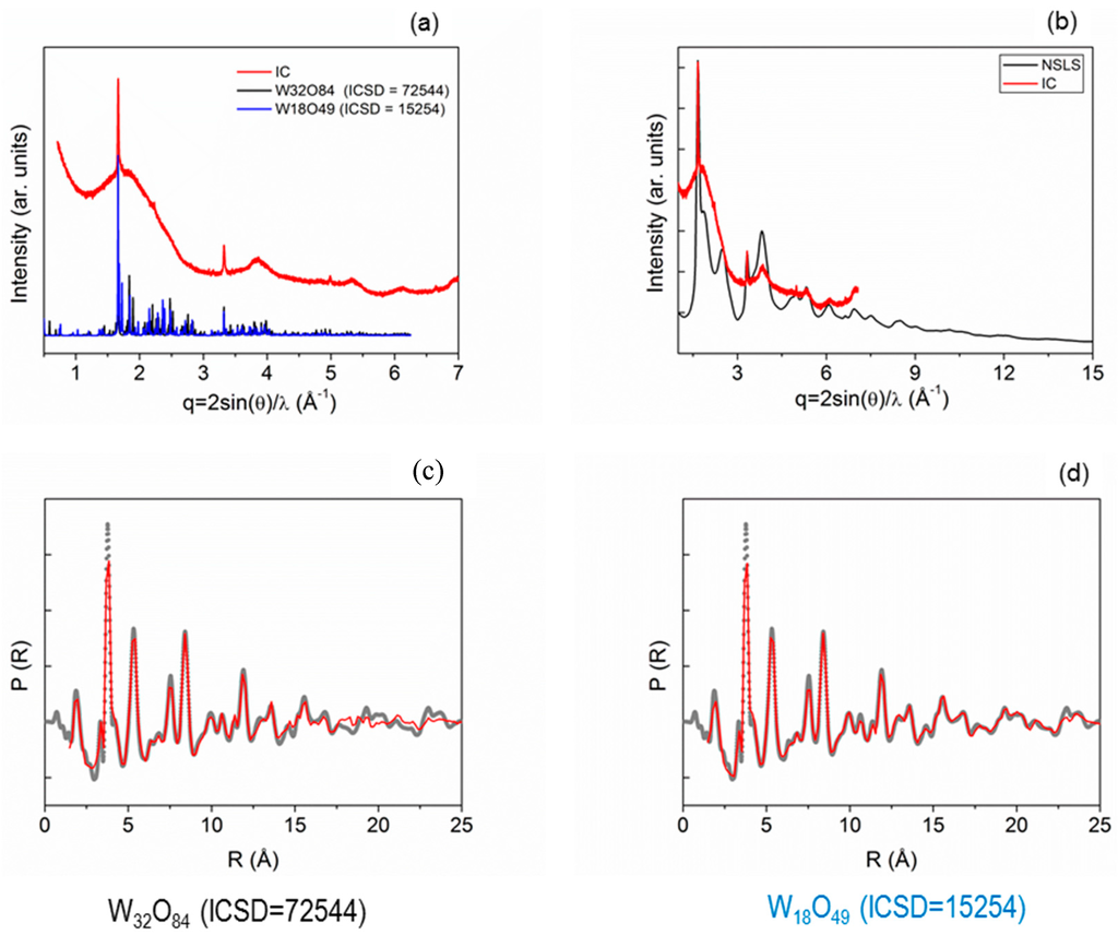 (a) X-ray diffraction (XRD) pattern of a WOx rod-like material, indexed with two different Magnéli phases: the orthorhombic W32O84 (ICSD #72544) and the monoclinic W18O49 (ICSD #15254); (b) diffraction data collected in transmission scanning mode with λ = 0.18597 Å at the X17A beamline of the National Synchrotron Light Source (NSLS; NSLS-XPD) at Brookhaven National Laboratory (black line) compared to laboratory data (red line) collected with a Bruker D8-Discover diffractometer, in reflection mode, with Cu Kα1 radiation, i.e., λ = 1.540562 Å; (c) experimental PDF (dotted grey curve), derived from the NSLS diffraction profile in (b), and theoretical PDF (red lines) computed from the W32O84 (ICSD #72544); (d) experimental PDF (dotted grey curve) and theoretical PDF (red lines) computed from the W18O49 (ICSD #15254). Partially reprinted with permission from reference [].