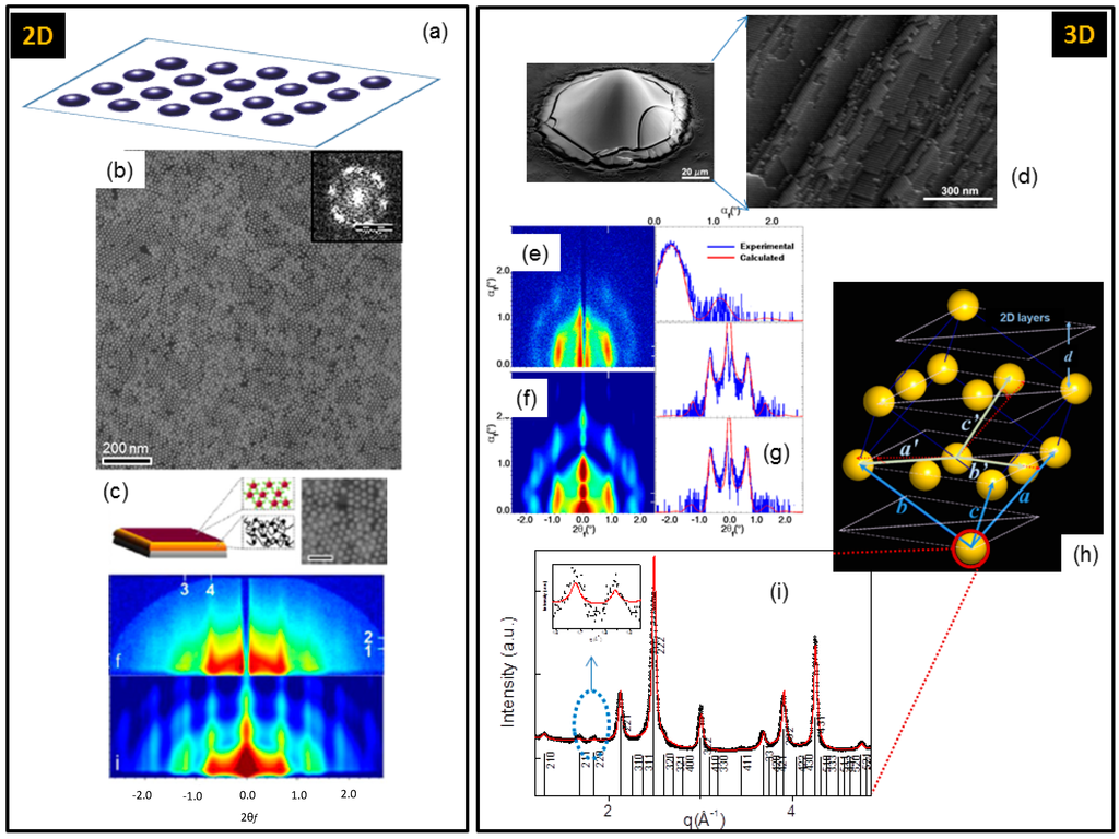 (a) a cartoon of a 2D assembly onto a surface; (b) Scanning Electron Microscopy (SEM) image of Au nanoparticles (NPs), drop casted onto a teflon functionalized silicon substrate, described by the top inset in (c); (c) experimental/calculated (upper/lower image) GISAXS data, collected at the XMI-L@b, and a detail of the Au NPs, as observed by TEM; (d) cone-shaped island made of iron oxide nanocrystals self-assembled by magnetic field onto a silicon substrate (left) and section of the island, imaged by SEM (right); (e–g) experimental and calculated GISAXS data; (h) 3D face centered cubic lattice, with (111) planes parallel to the substrate; (i) X-ray powder diffraction profile measured from the same sample in (a). Dotted curve is the experimental data, red line the fitted profile. The zoom in the inset corresponds to the (211) and (220) peaks with comparable intensities (in the blue circle of Figure 9i) which are characteristic of maghemite structure. Experiments are performed at the MS beamline of the SLS synchrotron source, in reflection mode, with λ = 0.495722 Å. Partially reprinted with permission from reference [,].