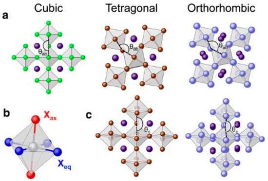 Possible crystalline phases of perovskite ABX3. (a) Typical perovskite structure with octahedral BX6 geometry (top view) of various phase cubic, tetragonal, orthorhombic and the relative side view pattern (c), where A = violet, B = gray, X = green, brown, cyan typically. (b) Illumination of octahedral BX6 with equatorial plane halide (Xeq, red) and axial plane halide (Xax, blue). Reprinted with permission of reference []. American Chemistry Society.