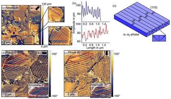 Whether the twinning structure represent ferroelectric or not keeps coming up as a question. Hermes et al. employed piezoresponse force microscopy (PFM) to characterize the a relative large and flat surfaces of MAPbI3 films []. Their results revealed the existence of subgrain twin domains in the tetragonal phase. The nanoscale periodic striped domain within single grain is shown in Figure 4a,b. These striped domains have their identical width within 100–300 nm in one grain, but vary between different grains. The 90° angle of stripes within grains shown in the magnified areas was a fingerprint-like structure for ferroelastic twin domains. It was supported by an additional PFM experiment on 90° rotated sample, for which the inverted phase contrast was found, with almost unchanged amplitude contrast (Figure 4d,e) []. Hermes et al. also proposed that the orientation of the polarization in the observed twin domains was a1–a2 phase, as seen in Figure 4c [].