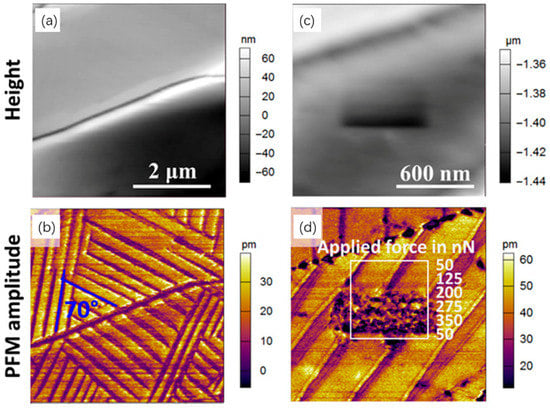 - Hooton, J.A.; Merz, W.J. Etch Patterns and Ferroelectric Domains in BaTiO3 Single Crystals. Phys. Rev. 1955, 98, 409–413. [Google Scholar] [CrossRef]