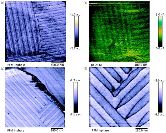 Recently, the alternating polarization striped domain with an average width of 90 nm was reported in solution-processed MAPbI3 film, as seen in Figure 6 []. Contrary to the previous report, these twin domains observed by PFM were considered as ferroelectric domains []. The 90° continuation of the domain within grains was observed clearly in Figure 6c,d, similar to the domains revealed by Hermes et al. []. Further investigation showed that the structure could provide 25% enhancement of the charge carriers extraction ability measured by the photo-conductive AFM (PC-AFM), as showed in Figure 6b [].