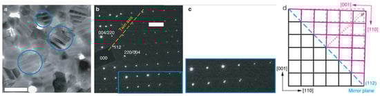 Employing PFM to detect subgrain twin domains is available for surface detection. However, the flat grain surface is needed to exclude the cross-talk of the surface structure with twinning morphology []. Hence, TEM, as a classical method to image twin domains in inorganic perovskite, is applied for investigating organometallic perovskite. Rothmann et al. reported intrinsic twin domains performed as ~100–300-nm-wide stripe in tetragonal phase MAPbI3 thin films as seen in Figure 7 []. These twin domains were observed with TEM under the condition of low electron dose and rapid acquisition to carefully avoid surface damage []. The selected area electron diffraction (SAED) result implied that the diffraction spot from adjacent domains were mirrored to each other across the twin axis and the twin axis was parallel [112] in direction. They claimed that the separation angle θ, which would be attributed to the difference of the lattice space distance of {110}t and {002}t planes at the tetragonal phase in MAPbI3, underpinned the twinning and formation of the {112}t twin plane []. They also found that the twin domain owed memorized characteristics. The striped contrast which existed at room temperature (tetragonal phase) disappeared in 70 °C (cubic phase). It turned out again when the sample cooled down to room temperature. This phase transformation-related phenomenon is consistent with the twin domain observed in inorganic perovskite BaTiO3 [].