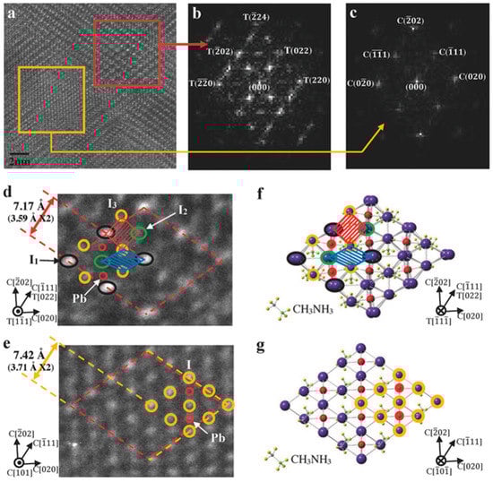 The coexistence of tetragonal and cubic phase in MAPbI3 thin films. (a) HRTEM (×1000 K) image showing the coexistence of the tetragonal and cubic domains in perovskite. (b) The FFT image of (red rectangle, tetragonal phase) zone axis FFT. (c) The FFT image of (yellow rectangle, cubic phase). HRTEM (×5500 K) images of tetragonal phase (d) at zone axis and cubic phase (c) at zone axis. (f), (g) illustrate the atomic configurations simulated along and . Reprinted with permission from reference []. John Wiley and Sons.