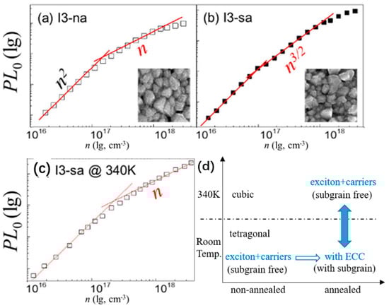 (a–c) Relation of photoluminescence intensity (PL0) and excitation density (n) for MAPbI3 thin films with non-annealed (I3-na), sufficient annealed (I3-sa), sufficient annealed while investigated at 340 K (I3-sa @340 K). (d) Schematic of photoproduct system and the conversion relation for MAPbI3 which illustrated that the typical ECC observed in annealed perovskite thin films at tetragonal phase. Reprinted with permission from reference []. Springer Nature.