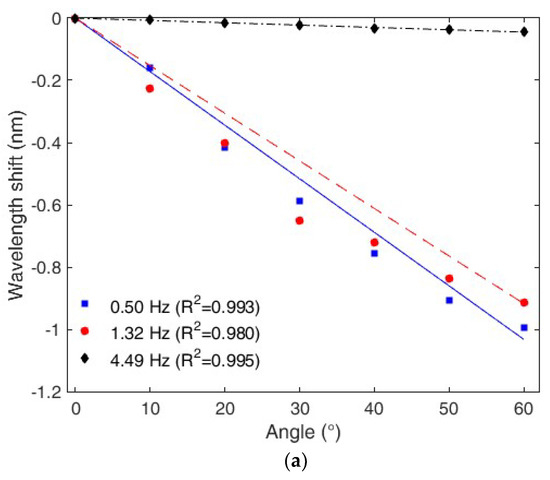 In addition, the responses presented in Figure 7a also shows the linear behavior of the sensor at each frequency. Therefore, the model “m3” is a linear regression relating the wavelength shift with sensitivity and hysteresis compensation and the angle.