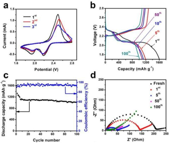 Figure 6d presents the Nyquist plots of Li/S cells assembled with a S/OMPW cathode before discharge and after different cycles at 0.1 C. ZSimpWin software (Princeton Applied Research) was applied to analyze the EIS data, and equivalent circuits of fresh and cycled cells were compiled in Figure 6e,f, respectively. In this circuit, Ro and Rct represented contact resistance and charge transfer resistance, respectively. Rs was the interfacial resistance corresponding to the solid electrolyte interphase (SEI) film formed on the electrode surface [8]. Zw and CPE represented the Warburg diffusion and double layer capacitance, respectively. Table 1 lists the fitted impedance parameters presented in Figure 6d. The Rct value decreased gradually from 197.5 Ω (fresh) to 31.9 Ω at the 5th cycle, related to the increased transportation of electrons and Li+ after the electrochemical activation and redistribution of non-conductive crystalline sulfur deposited on the OMPW surface during cycling [45]. The relatively stable impedance data from the 50th to 100th cycles indicated the advantages of OMPW and the combination of one-dimensional and interconnected mesoporous structures to accelerate the diffusion of Li+.