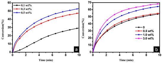 STX was used as the photoinitiator for the polymerization of TMPTA in laminate under the xenon lamp exposure (I = 28 mW cm−2). In order to decrease the viscosity of the TMPTA photopolymerization system, THF was used as the diluent. The photopolymerization kinetic profiles of TMPTA initiated by STX in different concentrations without hydrogen donor are shown in Figure 2a. As seen from Figure 2a, the increase of the initiator content makes a short induction period. It could be that the higher concentration of the photoinitiator could yield more radicals by the incident light, which is consistent with the photopolymerization behavior of TX-B (Figure S5 in Supplementary Materials). The higher concentration of free radicals could accelerate the photopolymerization rate sometimes, but it could also accelerate the recombination of primary radicals. So, the polymerization rate increases more and more slowly with the increase of the photoinitiator concentration. The gelation restricts the diffusion and mobility of macroradicals and pendant double bonds and slows down the rate of radical termination. This results in a buildup of radical species, promoting the rate of polymerization, leading to autoacceleration. However, the increased crosslinking level eventually limited the monomer mobility; the propagation reaction then also becomes diffusion-controlled along with radical termination. Thus, the overall polymerization rate decreases.