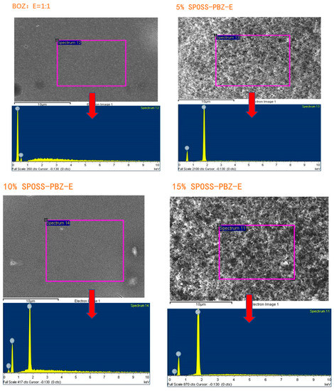 Figure 9 displays the cross-sectional images of materials with various SPOSS-BOZ contents. The hybrid materials had a good distribution, and microphase separation was not observed in the matrix. As seen from the image of the benzoxazine/epoxy resin, the majority of the POSS particles are in the size range of 80–200 nm. However, when the amounts of SPOSS-BOZ reached 10 wt % and 20 wt %, the fracture surface was very rough. Furthermore, as shown in Figure S3, Supplementary Materials and according to the results in Table 2, an EDX analysis showed the presence of POSS particles. The different contents of silicon atoms indicate the different contents of POSS particles in the whole system.