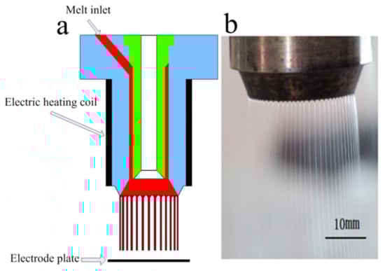 Needleless melt electrospinning of annular tip nozzle: (a) schematic, (b) photo.