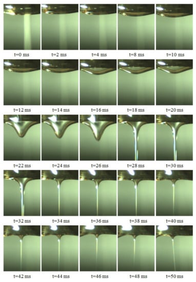 In the high voltage electrostatic field, the surface of the melt as a dielectric was polarized, forming polarized charges that charged the melt surface. The charged droplet in the electric field would be deformed, and the tip charge of the deformed droplet would be concentrated. When the charges accumulated to a certain stage, the sum of the electric field force and gravity on the droplet was greater than the sum of its surface tension and viscous force, a jet would be formed. As can be seen from the Figure 3, the development of the jet underwent a process from large volume to small volume. At the beginning stage, there was a large amount of melt at the tip of nozzle, and viscous force caused the melt around the root of the jet to gather toward its center, leading to the large jet volume, as shown in 0 to 32 ms of Figure 3. As the jet fell and a large amount of melt was removed, the volume of the jet decreased rapidly. When the speed of the melt transported by the extruder was the same as that of the melt carried away by the jet falling, the size of the jet gradually tended to be stable and unchanged, as shown in 34 to 50 ms of Figure 3.
