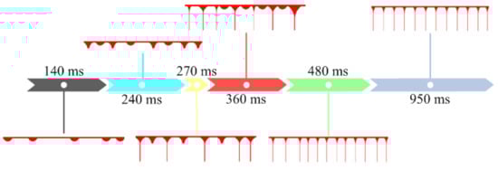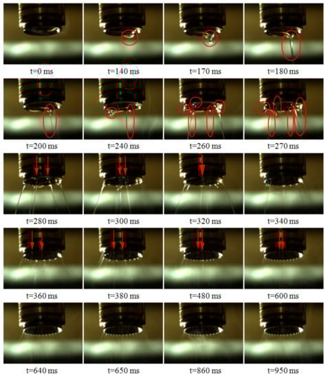 The relevant analysis was extended from the generation of a single jet to the distribution process of the multiple jets at the tip of the annular nozzle. When the applied voltage was 30 kV, the jets lasted for about 950 ms from generation to stabilization, and some of the jet distribution photos are shown in Figure 4. The jet distribution process can be roughly divided into three stages: random jet generation, jets gap filling and uniform distribution.