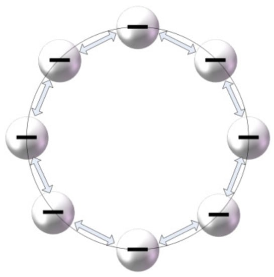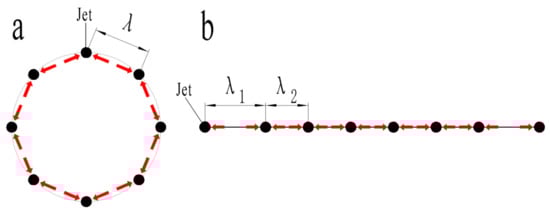 The schematic diagram of the relevant principle is shown in Figure 12, black dots stand for jets, red arrows stands for repulsion, λ stands for jets spacing. On the annular closed curve, the force of each jet is the same, making λ the same, but on the open straight-line, the jets at both ends are only subjected to one-way repulsive force, which increases the jet spacing, making λ1 > λ2. A similar phenomenon was observed in solution electrospinning. For example, in array capillary electrospinning, although the needle position was fixed, the jets repelled each other, and the jets close to the outside bent outward under the action of repulsion []. The same phenomenon had also been observed in the free surface needle-free solution electrostatic spinning [].