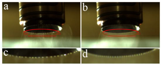 Experiments on annular closed curve tip nozzle with enlarged diameter further confirmed the correctness of the above conclusions. As shown in Figure 13, when the annular tip diameter of the nozzle was expanded to 52 mm, the melt could still form uniformly distributed and stable multiple jets under the high voltage electric field due to the equilibrium of interaction forces between jets.