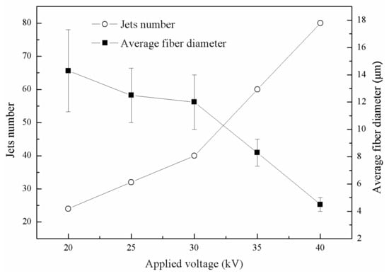 The melt supply was constant, so the increase of the number of jets would reduce the volume of each jet and made the fiber thinner. In addition, when the voltage increased, the electric field force on the jets increased with the increase of polarized charge density of the jets, and then the jets speed and melt tensile rate increased, further thinning the fibers []. The number of jets increased with the increase of voltage, reaching 80 at 40 kV. Meanwhile, the average diameter of fibers decreased with the increase of voltage, as shown in Figure 8. The morphologies of the fibers were investigated by scanning electron microscopy (SEM), as shown in Figure 9. The standard deviation of fiber diameter distribution also decreased with the increase of voltage, which was because the increase of voltage enhanced the repulsion between jets, accelerated the self-organization process of jets, and promoted the uniform distribution of melt flow on each jet, resulting in uniform distribution of fiber diameter. Therefore, high induced electric field intensity could help improve the spinning efficiency and further refine the fibers.