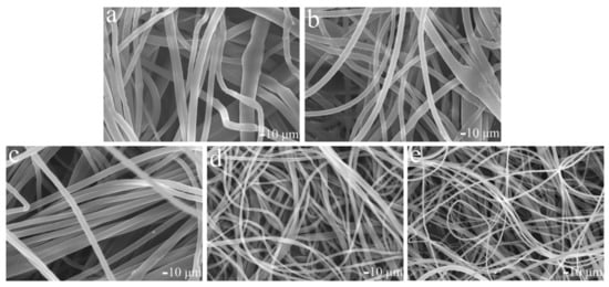 Electrospinning, as a special preparation method of fibers, can prepare polymer fibers with diameters in the range of from nanometers to the submicron scale [,,]. Many functional materials, for application in biochemical protection, tissue engineering, hyperfiltration, wound dressing, catalysis, and biomedicine, have been fabricated by this method [,,,,,,]. Compared with solution electrospinning, melt electrospinning showed great advantages, e.g., solvent-free residue, high production efficiency, environmentally friendly [,,].