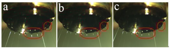 Photos of local jet distribution at different times when the spinning voltage is 20 kV: (a) 550 ms, (b) 650 ms, (c) 750 ms.