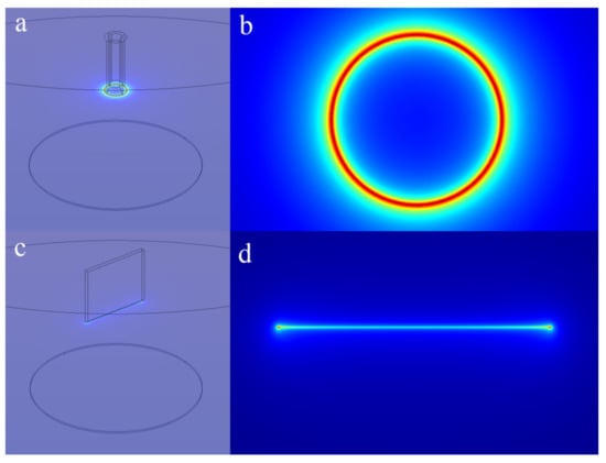 Distribution of the induced electric field: (a,b) annular tip; (c,d) straight-line tip.