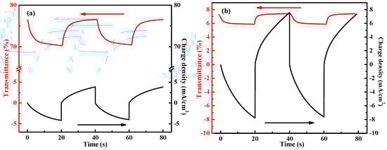 The coloration switching responses as an important parameter is vital to evaluate the electrochromic performance in terms of energy consumption and coloration switching. The coloration properties of all the PANI-based nanocomposites films were studied by applying potential steps of 0.8 and −0.2 V with a pulse width of 20 s. Figure 5a–d shows the transmittance-time (red) and the corresponding charge density-time curves (black) at 633 nm under an alternative square-wave voltage of 0.8 and −0.2 V with 20 s interval. The transmittance modulations, transmittance difference between the bleached and colored states in the electrochromic materials, as 6.12, 1.71, 9.04, and 4.52% are calculated for the pristine PANI, double layer graphene/PANI, double layer WO3/PANI, and triple layer WO3/graphene/PANI nanocomposites films, respectively. Decreased transmittance modulations of graphene contained films confirm further the block effect of the introduced graphene.