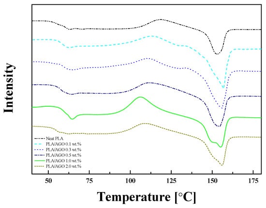 DSC measurements of the contents of the PLA/AGO composites were taken to analyze the crystallization behavior. Figure 4 plots the endo (down)—exo (up) curve at a heating rate of 10 °C/min, and Table 1 lists the characteristic thermal peaks. The degree of crystallinity (χ) was calculated using the following equation [,]: