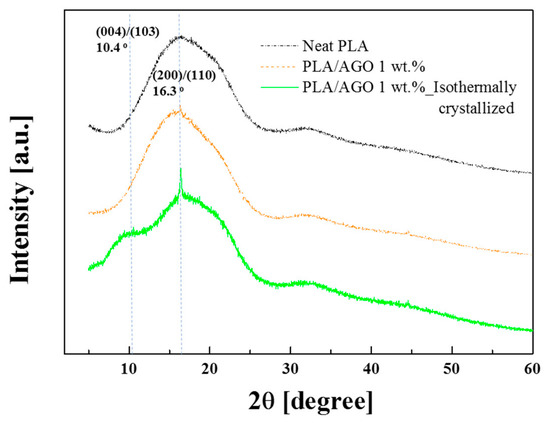 Despite its potential applications, such as the biomedical and packaging industries, PLA still lacks the appropriate mechanical properties for injection and extrusion molding []. Crystallinity plays a crucial role in controlling mechanical performance in rigid molded applications []. This study compared the crystallization behaviors of isothermal crystallized PLA/AGO nanocomposites, neat PLA, and PLA/AGO 1 wt % without any treatment by XRD (Figure 5). First, by comparing the neat PLA and untreated PLA/AGO 1 wt %, a slight increase in the (200)/(110) α′ form of the PLA homocrystallite was formed at 16.3° 2θ [,]. After isothermal crystallization at 70 °C, a significant increase was observed at the same spot (16.3° 2θ). Moreover, a shoulder peak was observed at 10.4° 2θ, which is also a sign of the (004)/(103) α form of PLA []. Therefore, incorporating an AGO filler and isothermal crystallization promotes nucleation and crystal growth.