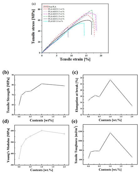 (a) Stress−strain curves of pure PLA and PLA/AGO composites and variation of (b) tensile strength (c) elongation at break (d) Young’s modulus (e) tensile toughness as a function of the AGO contents.