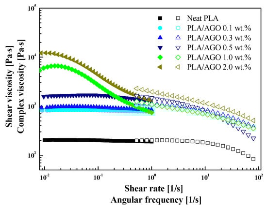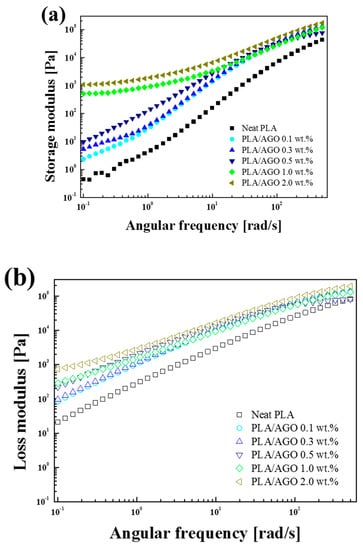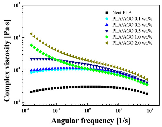 From the dynamic oscillatory shear measurements, the complex viscosity was obtained as a function of the frequency, as shown in Figure 8. The complex viscosity showed a similar trend to that of the shear viscosity and exhibited a strong dependency on the addition of AGO filler. Neat PLA showed a Newtonian plateau in the low angular frequency region. As the filler content increased, however, the composite showed a shear-thinning property. The initial complex viscosity increased with increasing AGO, and showed a typical sharp increase in the filler content between PLA/AGO 0.5 wt % (1990 Pa∙s) and PLA/AGO 1.0 wt % (5850 Pa∙s). Such behavior was attributed to the change in the internal microstructure of the filler, which is expected to be cross-linked because the filler content is above the percolation threshold [].