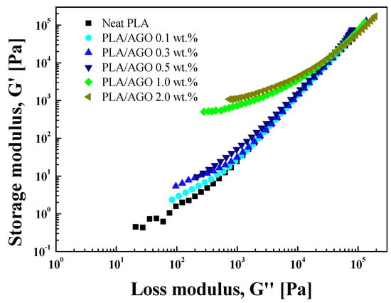 Some rheological studies of PLA/GO nanocomposites have recently been reported [,], but extensive characterization has seldom been carried out. Rheological studies of nanocomposites are crucial to proving the performance of polymeric nanocomposites derived by the interconnection and dispersion state of the fillers in the polymer matrices in addition to managing their flow characteristics, which are strongly associated with their processability. The rheological properties depend on the filler size, shape, and surface chemistry. Thus, by combining the chemistry, morphology of the filler, and rheological properties of the composite, the tester can obtain the valuable part during a new process setup [,].