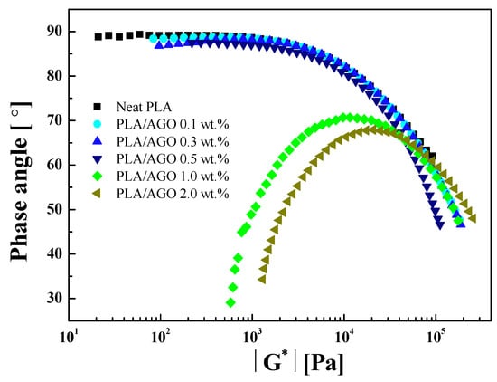 In addition to the modified Cole−Cole plot, the formation of a solid-like structure can also be explained by the van Gurp−Palmen (VGP) plot in Figure 12. The VGP plot is a diagram of the phase angle in the function of the complex modulus. The low loading of the AGO nanocomposites (0.1–0.5 wt %) showed similar behavior to the neat PLA. In particular, the composite showed a viscous property for a phase angle close to 90° in a low complex modulus region. For the samples with a high loading AGO, however, the values were below 45° in a low complex modulus region. The dramatic decrease in the phase angle indicated a physically cross-linked network structure of AGO fillers [,].