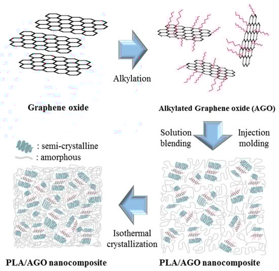 Overall schematic diagram from alkylation of graphene oxide (GO) sheet to processing PLA/AGO nanocomposite.