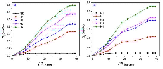 In Figure 1, Figure 2 and Figure 3 (the sorption curves Qt vs. t1/2 for composites reinforced with hemp, flax and sawdust), the diffusion coefficient D was calculated from the slope θ of the initial linear portion, using the following Equation (3) [66,67,68]: