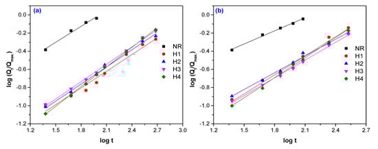 Determination of the diffusion parameters n and k for NR samples reinforced with hemp and vulcanized by electron beam (EB) irradiation at 75 kGy (a), 150 kGy (b), 300 kGy (c), and 600 kGy (d).