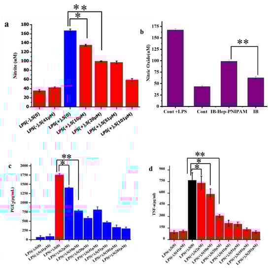 Previous studies have reported that ibuprofen has been loaded into the hydrogel to enhance anti-inflammatory activity and wound healing []. This study focuses on reducing inflammatory reaction and accelerating wound healing through thermosensitive IB-loaded Hep-PNIPAM hydrogel. To assess the anti-inflammatory effects of ibuprofen-loaded Hep-PNIPAM hydrogel, the NO, PGE2, and TNF-α levels were measured in RAW264.7 macrophages [,,]. Cells were pretreated with ibuprofen-loaded Hep-PNIPAM hydrogel for 1 h and stimulated with LPS for 24 h. The LPS stimulation of IB-Hep-PNIPAM-treated RAW264.7 cells significantly upregulated the proinflammatory mediators (NO, PGE2, and TNF-α) as compared with cells which were not stimulated with LPS. However, the pretreatment of RAW264.7 cells with IB-Hep-PNIPAM decreased the production of these proinflammatory mediators in RAW264.7 cells stimulated with LPS in a dose-dependent manner (Figure 6a,c,d). The production of each proinflammatory mediator was calculated according to the calibration curves (Figure S4). The suppression of proinflammatory mediator secretion by IB-Hep-PNIPAM was comparable to that of free ibuprofen, and was significantly downregulated as compared to LPS-induced cells (Figure 6b,e). Thus, IB-Hep-PNIPAM inhibits LPS-induced inflammation by suppressing the secretion of the proinflammatory mediators NO, PGE2, and TNF-α in RAW264.7 macrophages. The results are consistent with the previous studies [].