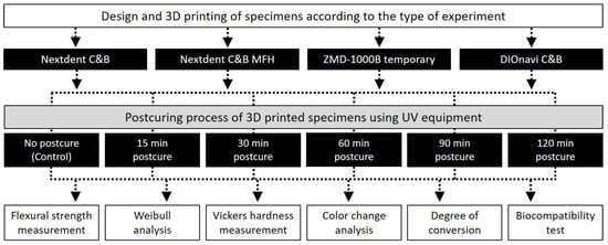 Flowchart of the overall experimental process of this study, showing the materials used, post-curing time, and experimental types.