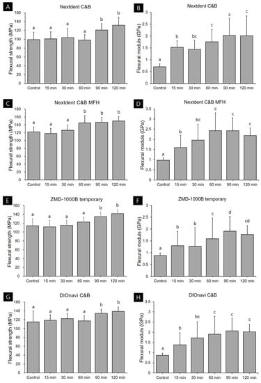 Flexural strength and modulus data according to post-curing time for each 3D printed resin: (A,B) Nextdent C&B, (C,D) Nextdent C&B MFH, (E,F) ZMD-1000B temporary, and (G,H) DIOnavi C&B. Data are mean and one-positive-standard-deviation values. Different lowercase superscript letters indicate significant differences in flexural strength and modulus for the same 3D printed materials.
