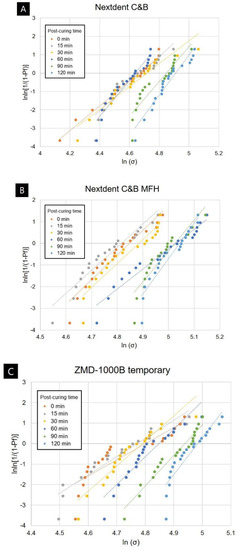 Weibull strength () and Weibull modulus (m) data for the four types of 3D printed resin specimens according to post-curing time.