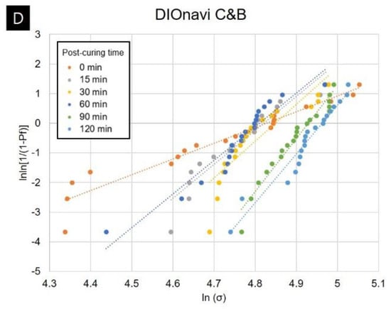 Weibull plots of 3D printed resin specimens for different post-curing times: (A) Nextdent C&B, (B) Nextdent C&B MFH, (C) ZMD-1000B temporary, and (D) DIOnavi C&B.