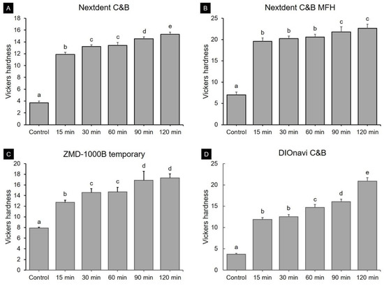 Vickers hardness according to post-curing time for (A) Nextdent C&B, (B) Nextdent C&B MFH, (C) ZMD-1000B temporary, and (D) DIOnavi C&B resins. Data are mean and one-positive-standard-deviation values. Different lowercase superscript letters indicate significant differences in Vickers hardness for the same 3D printed materials.