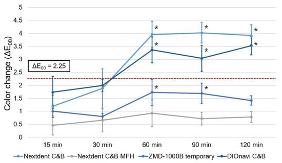 Based on the green-state group, the ΔE00 values calculated according to the post-curing time are shown in Figure 6. For Nextdent C&B MFH resin, no significant change in the ΔE00 value was observed in all groups after 15 to 120 min of post-curing. For the remaining three types of resins, the ΔE00 value changed significantly in the group subjected to post-curing for more than 60 min. In particular, in the case of Nextdent C&B and DIOnavi C&B resins, the ΔE00 value exceeded the clinically acceptable limit of 2.25 in most groups after at least 60 min of post-curing.
