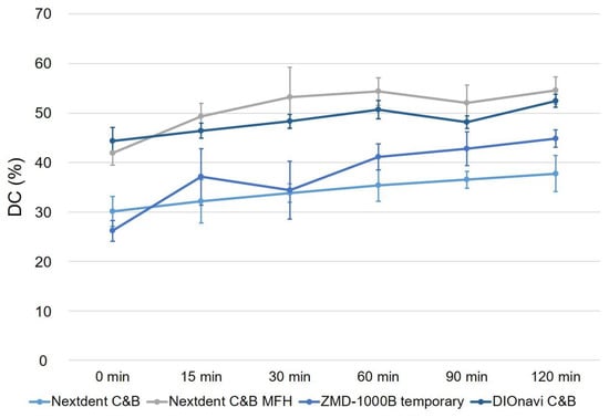 The DC value gradually increased with the post-curing time of the 3D printed resins. Data are mean and standard-deviation values.