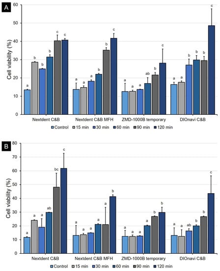 Cell viability evaluation graph by 3D printing resin. The cell viability gradually increased with the post-curing time. Data are shown as mean and standard deviation values. (A) 24 h and (B) 48 h. Different lowercase superscript letters indicate significant differences in cell viability for the same 3D printed materials.