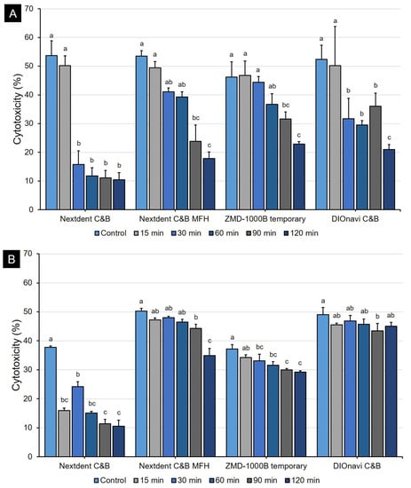 Evaluation of the cytotoxicity of 3D printing resins according to post-curing time. The cytotoxicity value gradually decreased with the post-curing time of the 3D printed resins. Data are mean and standard deviation values. (A) 24 h and (B) 48 h. Different lowercase superscript letters indicate significant differences in cytotoxicity for the same 3D printed materials.