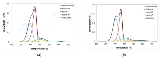 In addition, this technique is used to study the decomposition of the different components of lignocellulosic biomass—hemicelluloses, cellulose, and lignin [2,40]—and determine the kinetic parameters, such as activation energy (Ea), pre-exponential factor (K0), and pyrolysis heterogeneity factor (α). Table 6 shows the kinetic parameters obtained from the deconvolutions carried out on the DTG curves (Figure 5). These kinetic parameters are in agreement with those published [53,54,55,56,57]. From the area obtained in the integration of each curve associated with the decomposition of the biopolymers, the biocomposition of each of the samples is determined considering their carbonisation performance (Table 6). In the case of lignin decomposition, due to the high heterogeneity of the reaction, the calculation is carried out using two independent pyrolyses: the first one for lignin decomposes at low temperatures (LT) and the second one for lignin decomposes at high temperatures (HT), the second one being the most heterogeneous.