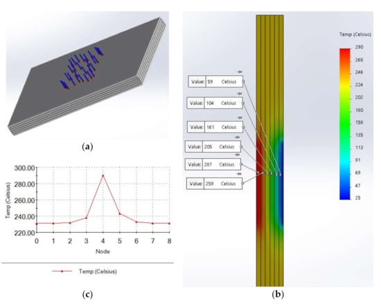 FEA simulation of the geometrical model: (a) Geometrical model of the composite; (b) Thermal field on thickness; (c) Temperature plots; (d) Thermal field on surfaces of each element of thickness considered.