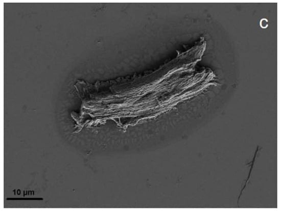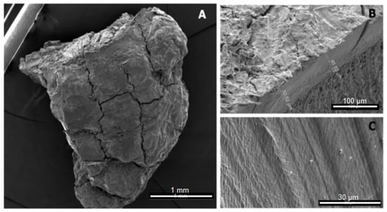 SEM image of a microplastic particle (A), mesoplastic (B), and a PE film (C) found by ter Halle et al., 2016, Reprinted with permission from ref. [], Copyright 2016, American Chemistry Society.